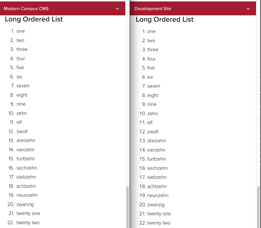 Ordered Lists in Crimson will no longer use custom CSS counters. This will allow users to take advantage of the variety of ordered list types available in the WYSIWYG toolbar without applying even more CSS to override the templates.